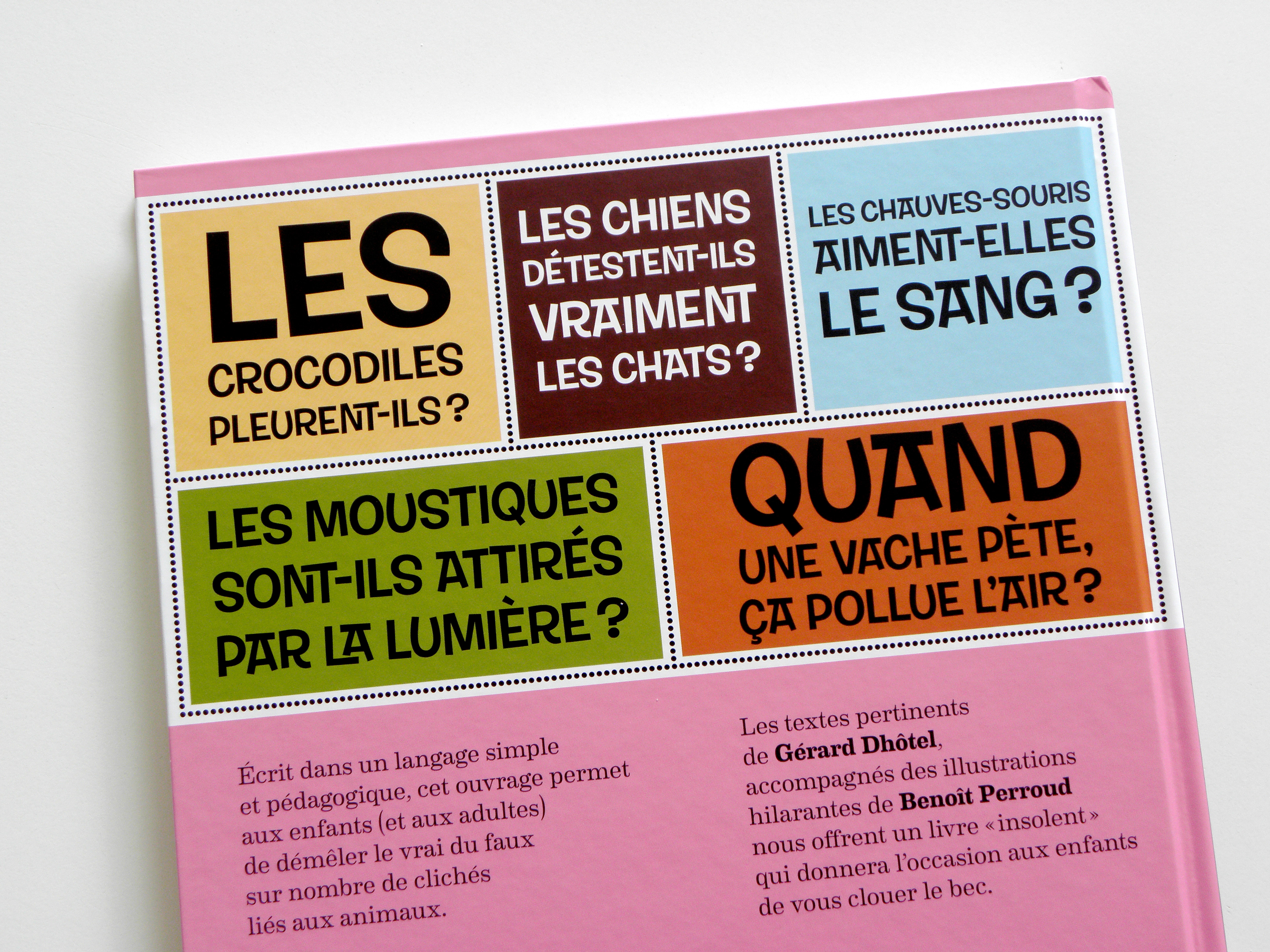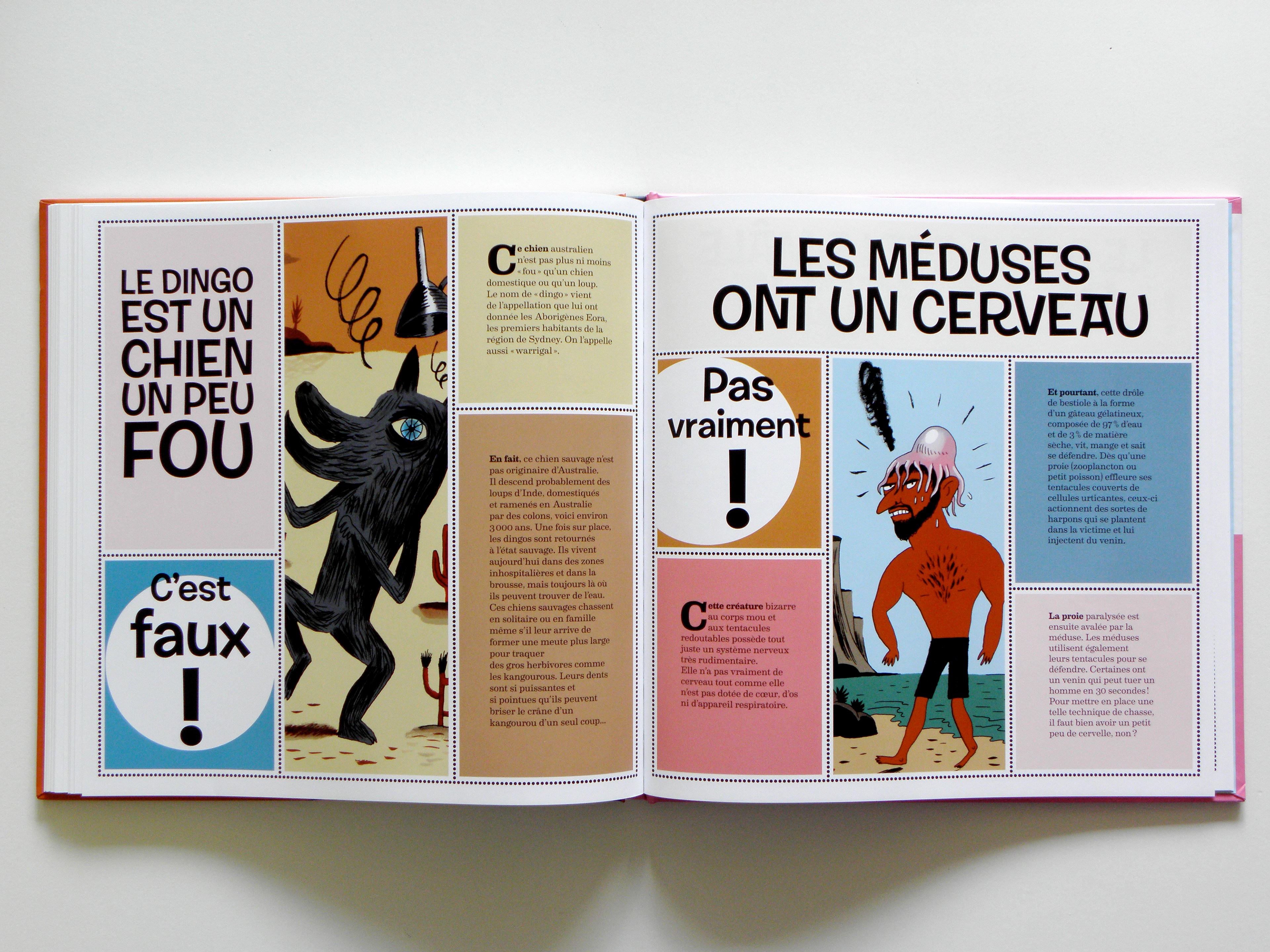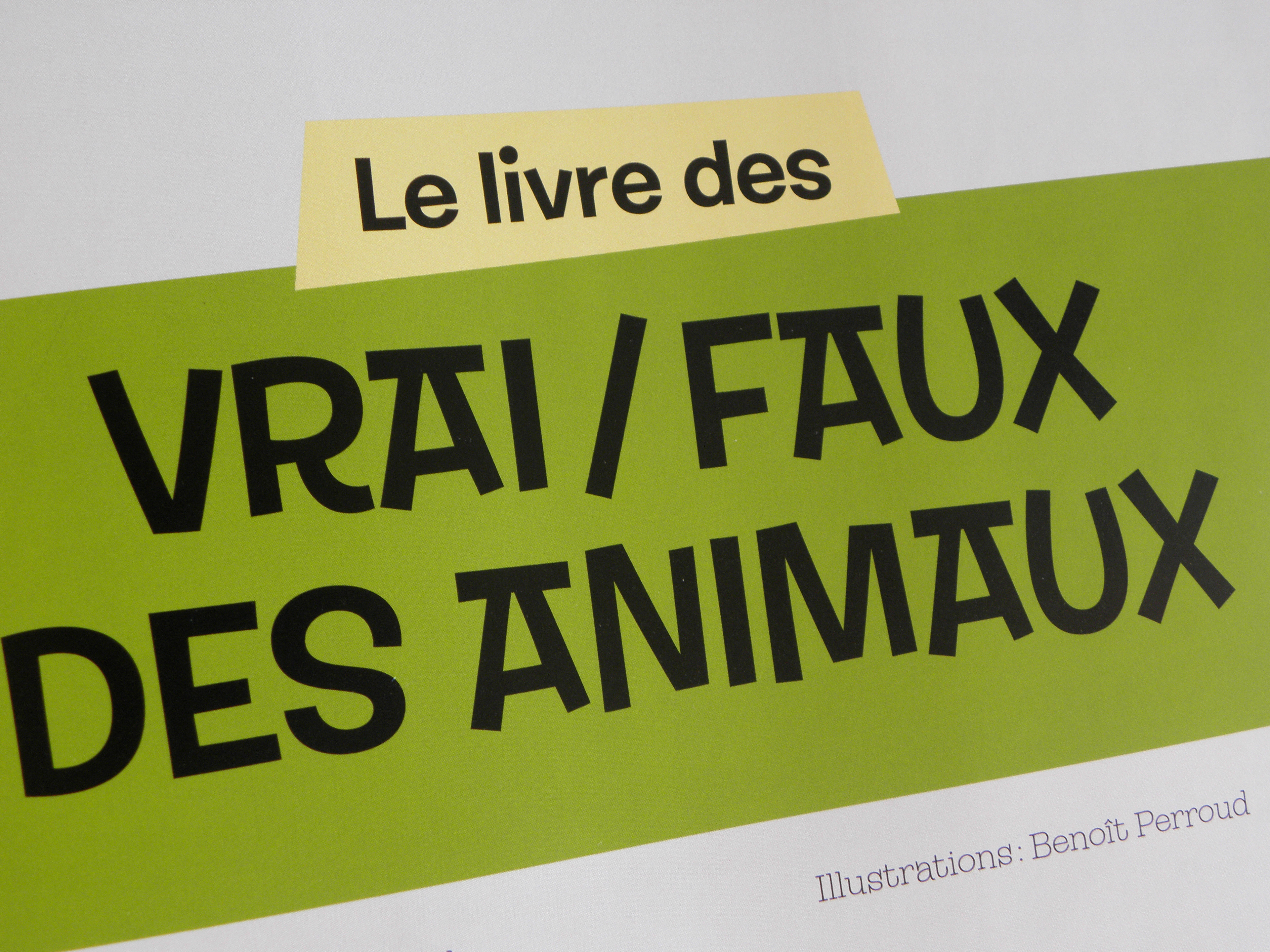 Conception et réalisation de la maquette d’un album pour enfants. Sur 80 pages une série d’idées reçues sur les animaux et les insectes sont confirmées ou infirmées. L’usage de blocs colorés et d’une police de caractères inspirée du travail de Shag permettent de rythmer la lecture.