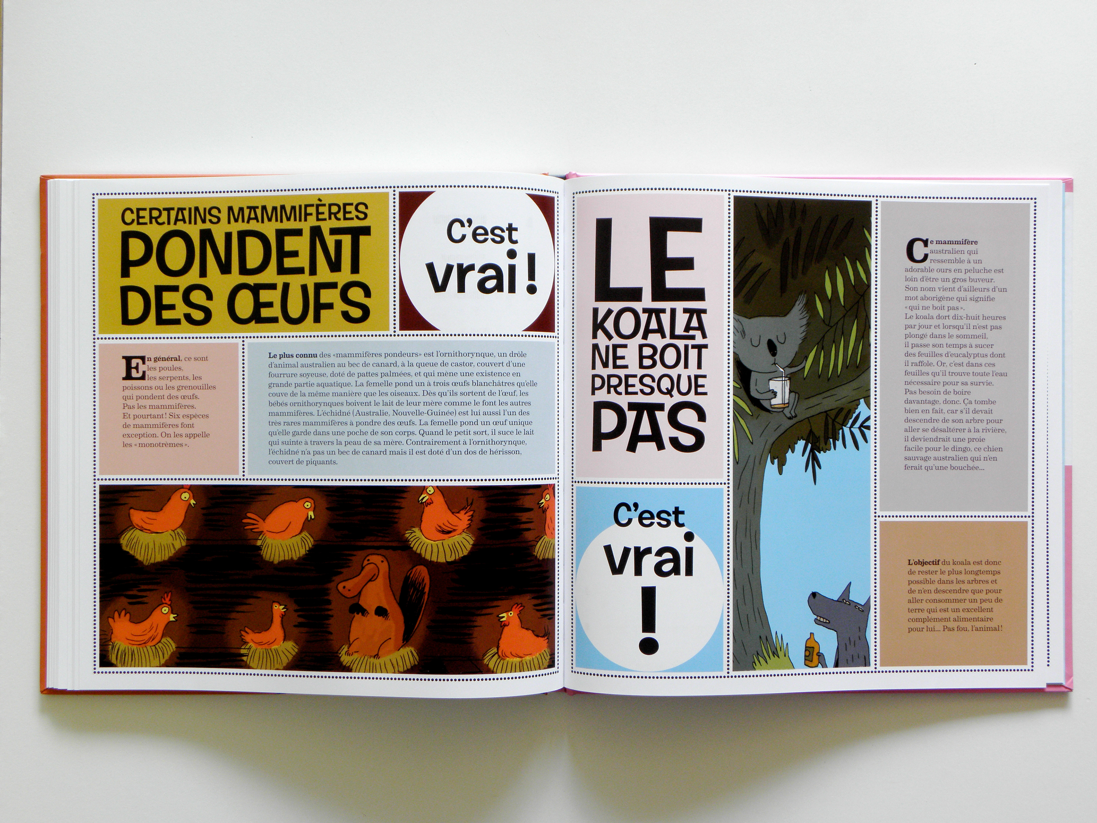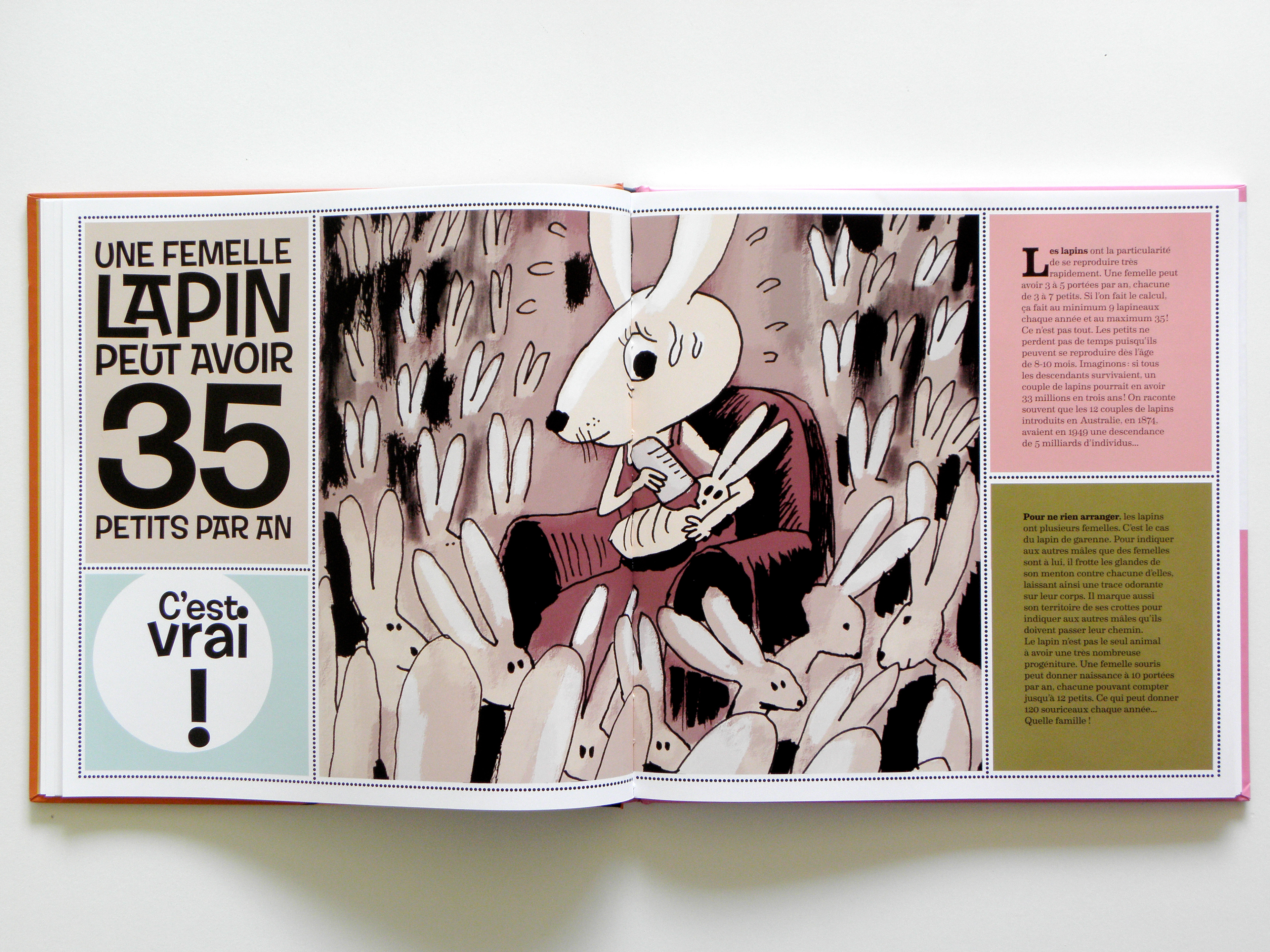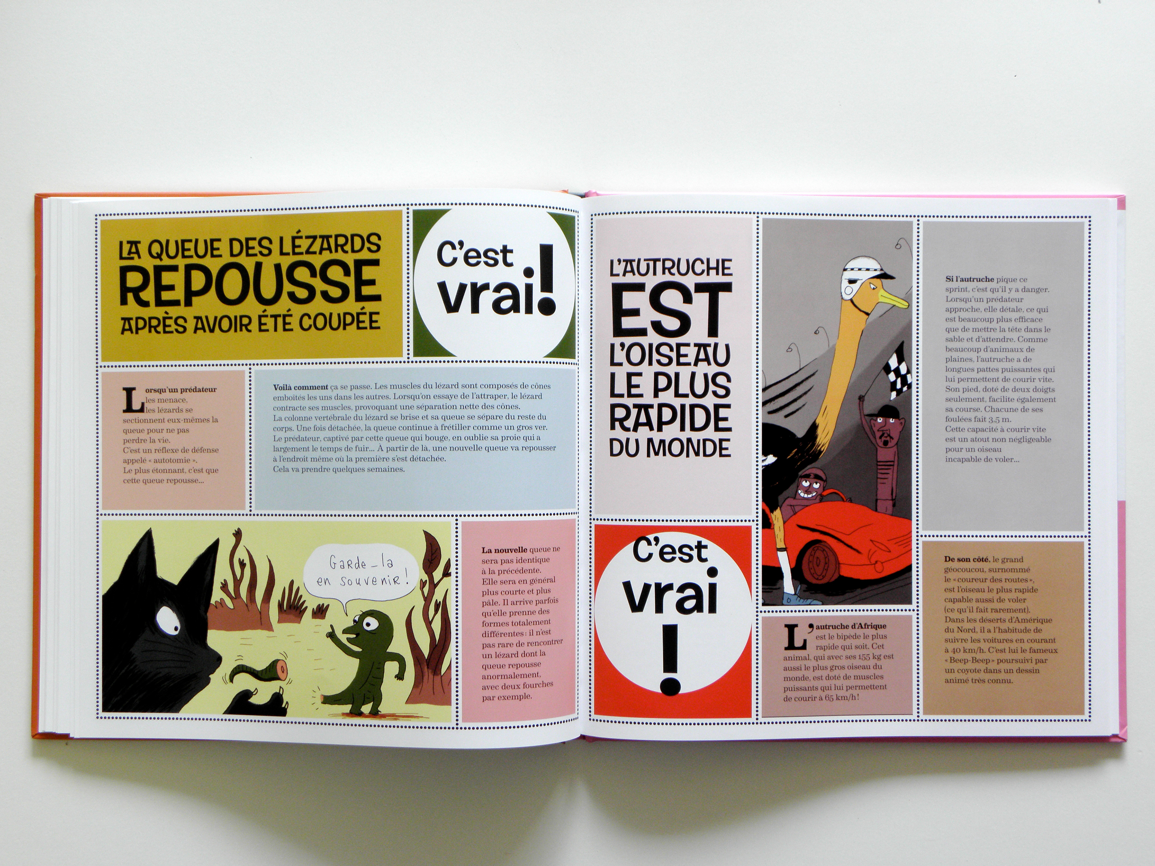 Conception et réalisation de la maquette d’un album pour enfants. Sur 80 pages une série d’idées reçues sur les animaux et les insectes sont confirmées ou infirmées. L’usage de blocs colorés et d’une police de caractères inspirée du travail de Shag permettent de rythmer la lecture.
